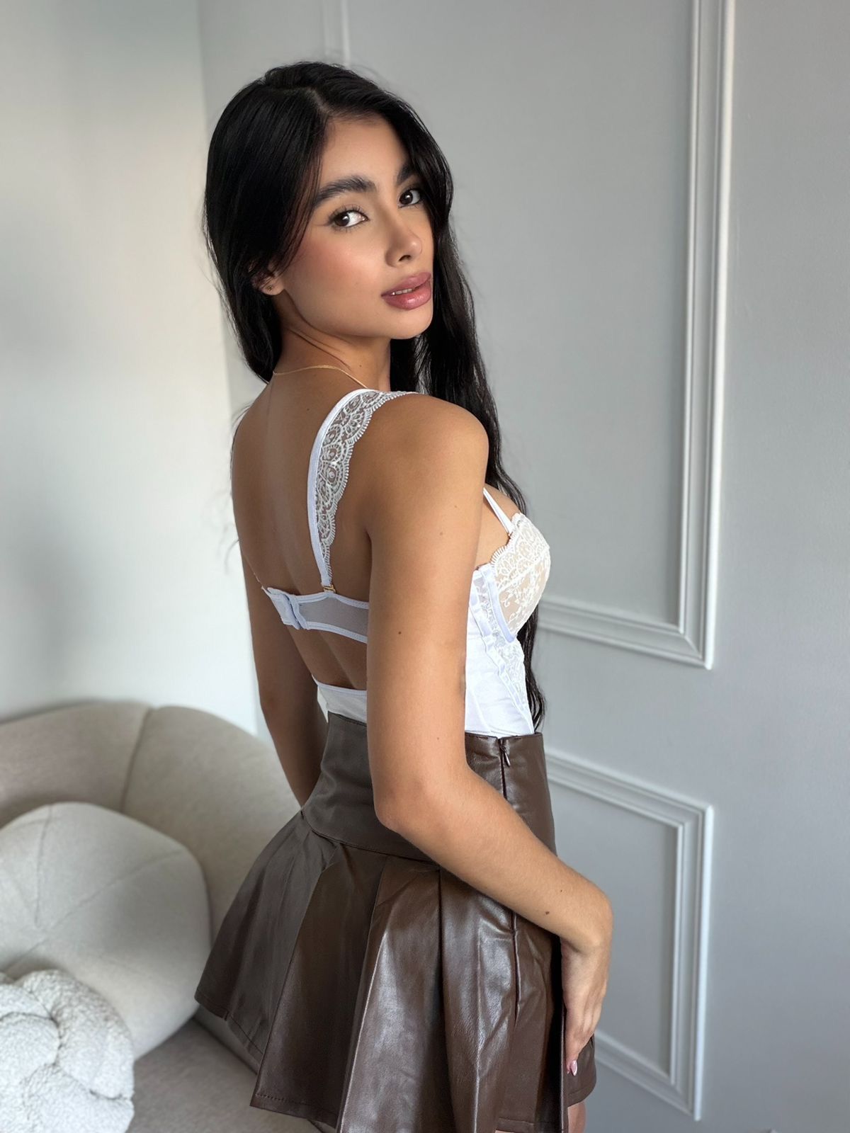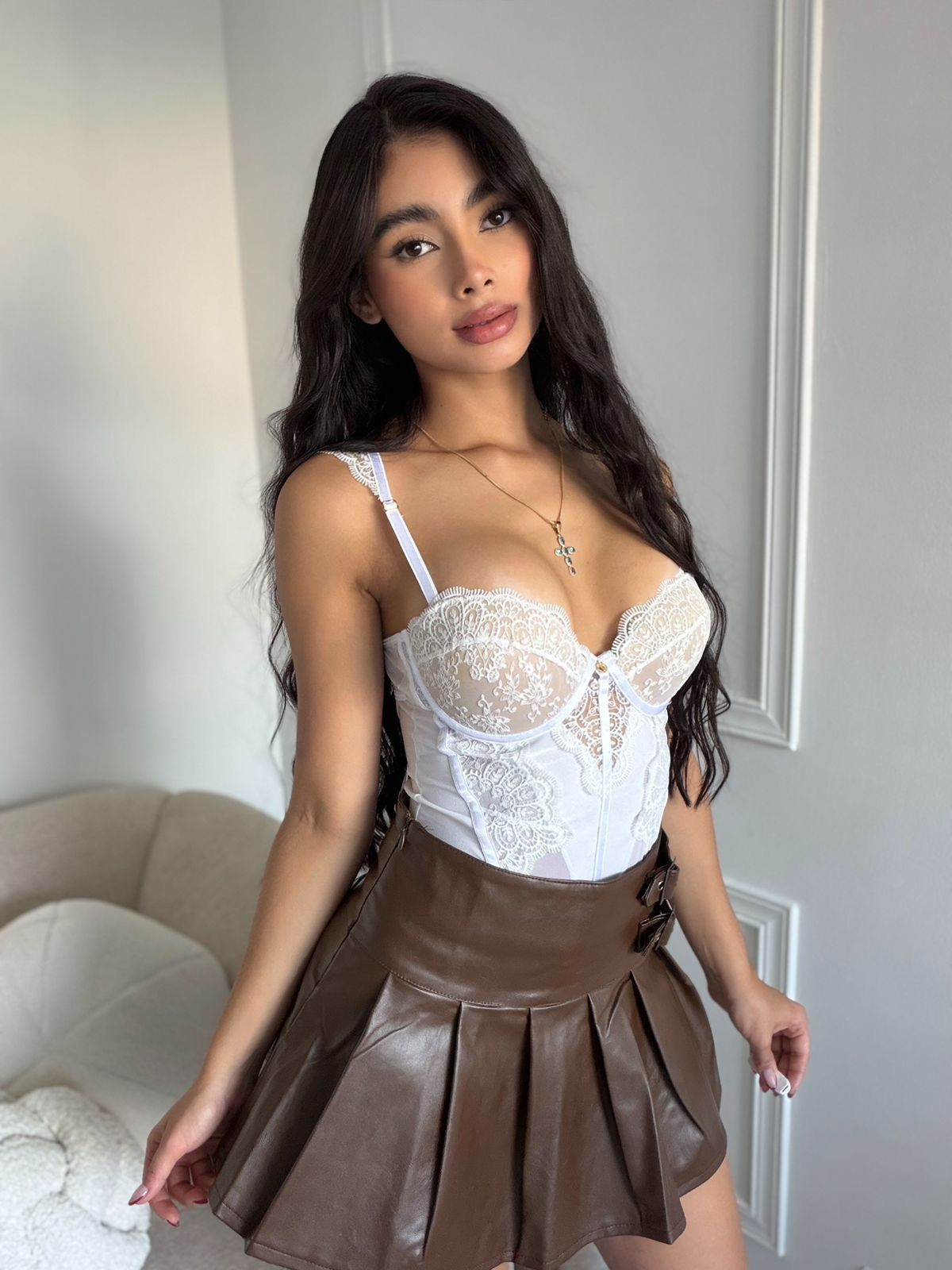 Este body blanco de encaje es una prenda sofisticada y femenina que destaca por su diseño delicado y sensual. Confeccionado en encaje floral semitransparente, realza el busto y estiliza la figura gracias a su estructura tipo corset y ajuste cómodo.