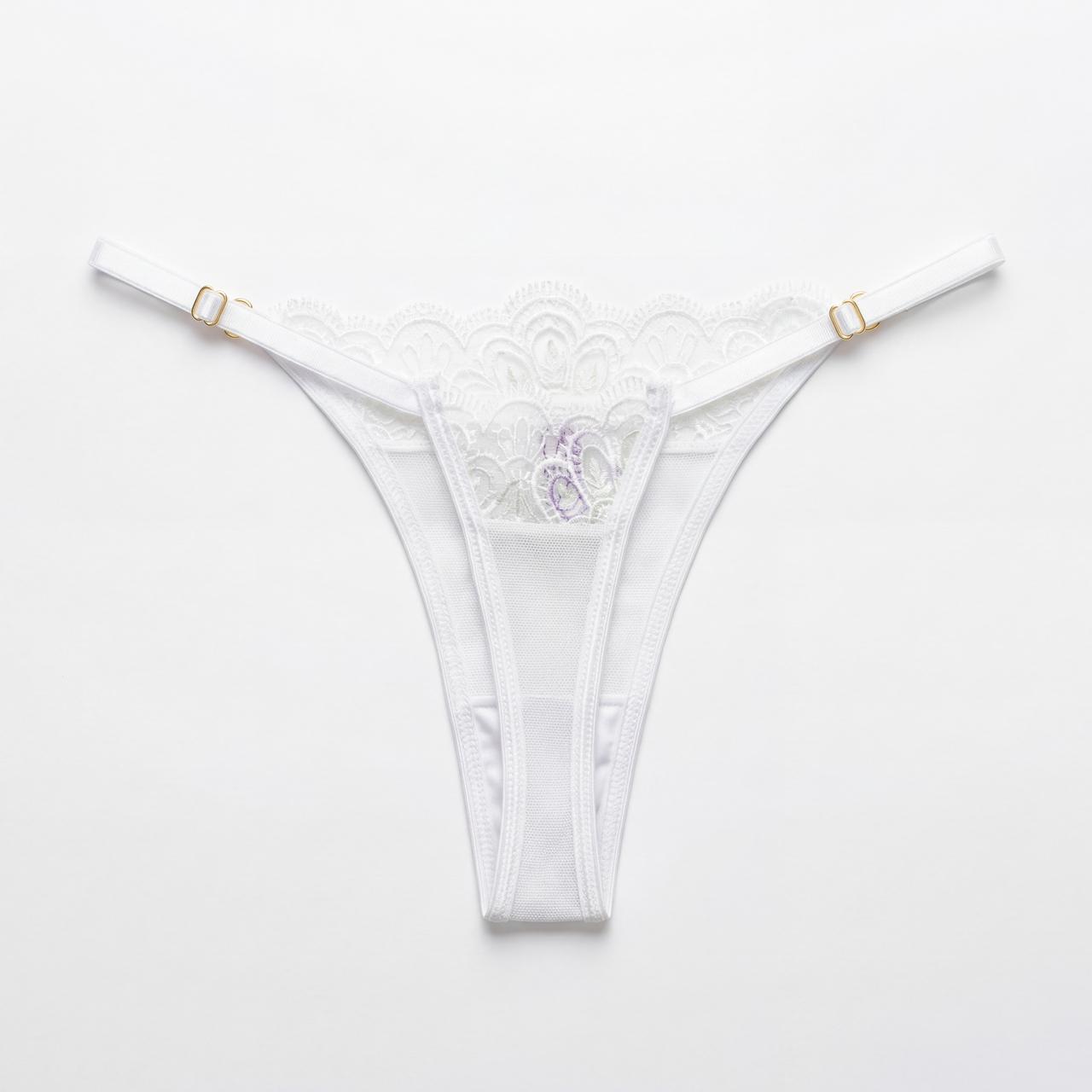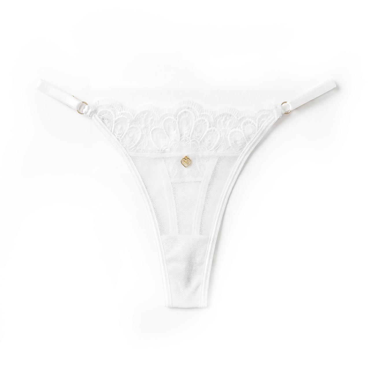 Panty blanco en encaje delicado, diseñado para realzar tu feminidad con un toque sutil y sofisticado. Su confección en encaje suave y ligero se adapta cómodamente al cuerpo, brindando una sensación delicada sobre la piel.